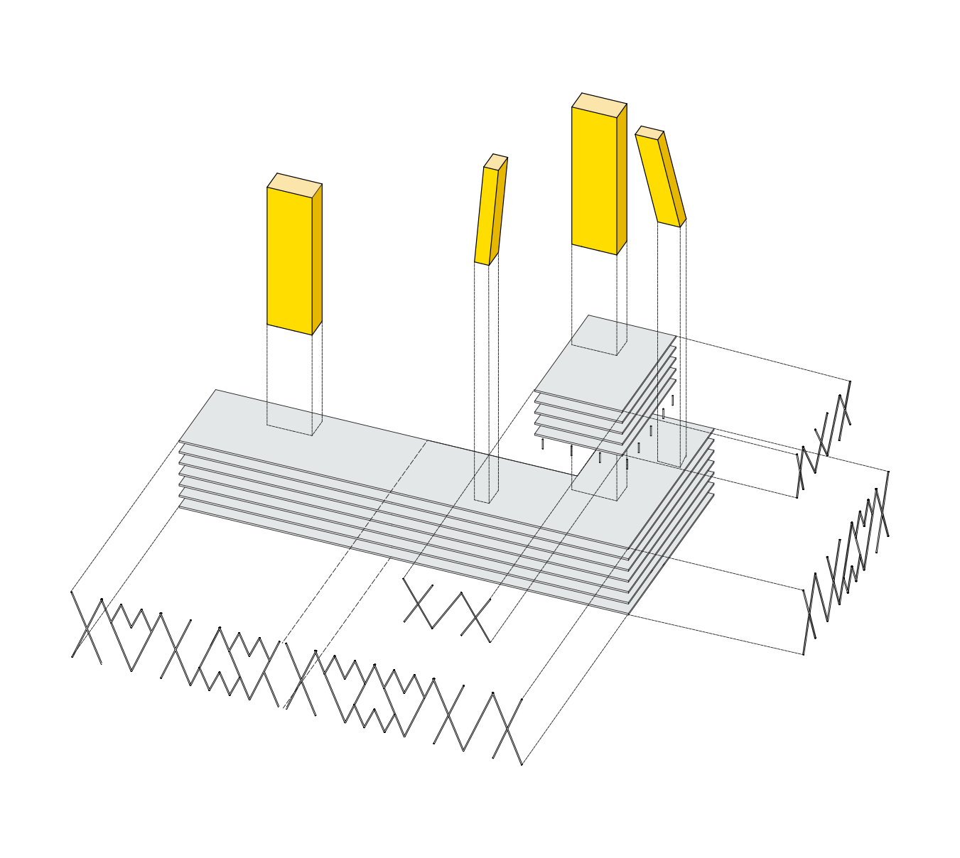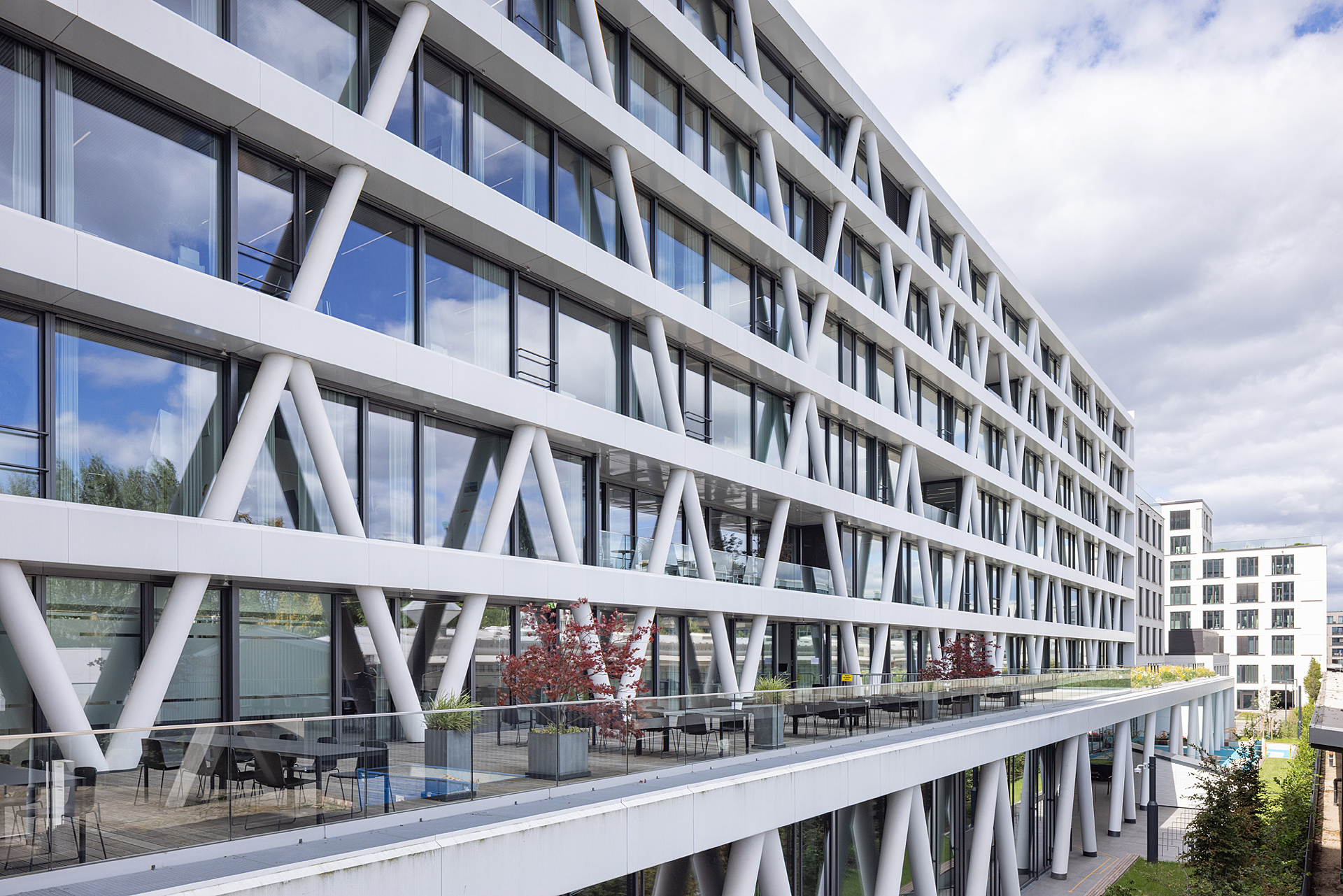 One thing that is remarkable at first sight is the facade of the building with its external support structure. It envelops the structure like a net – on the one hand, it constitutes a reference to the company’s corporate purpose as a network operator; it also recalls the engineering-style appearance of high-voltage pylons, substations, transformer systems, and the like. In addition, the external structure allows for a column-free facade level inside the building. As required by the company, what this means is that the interior area is completely flexible. The facade is crossed by several balconies on each floor. They serve as outside seating areas, outdoor workspace areas or places for short breaks.