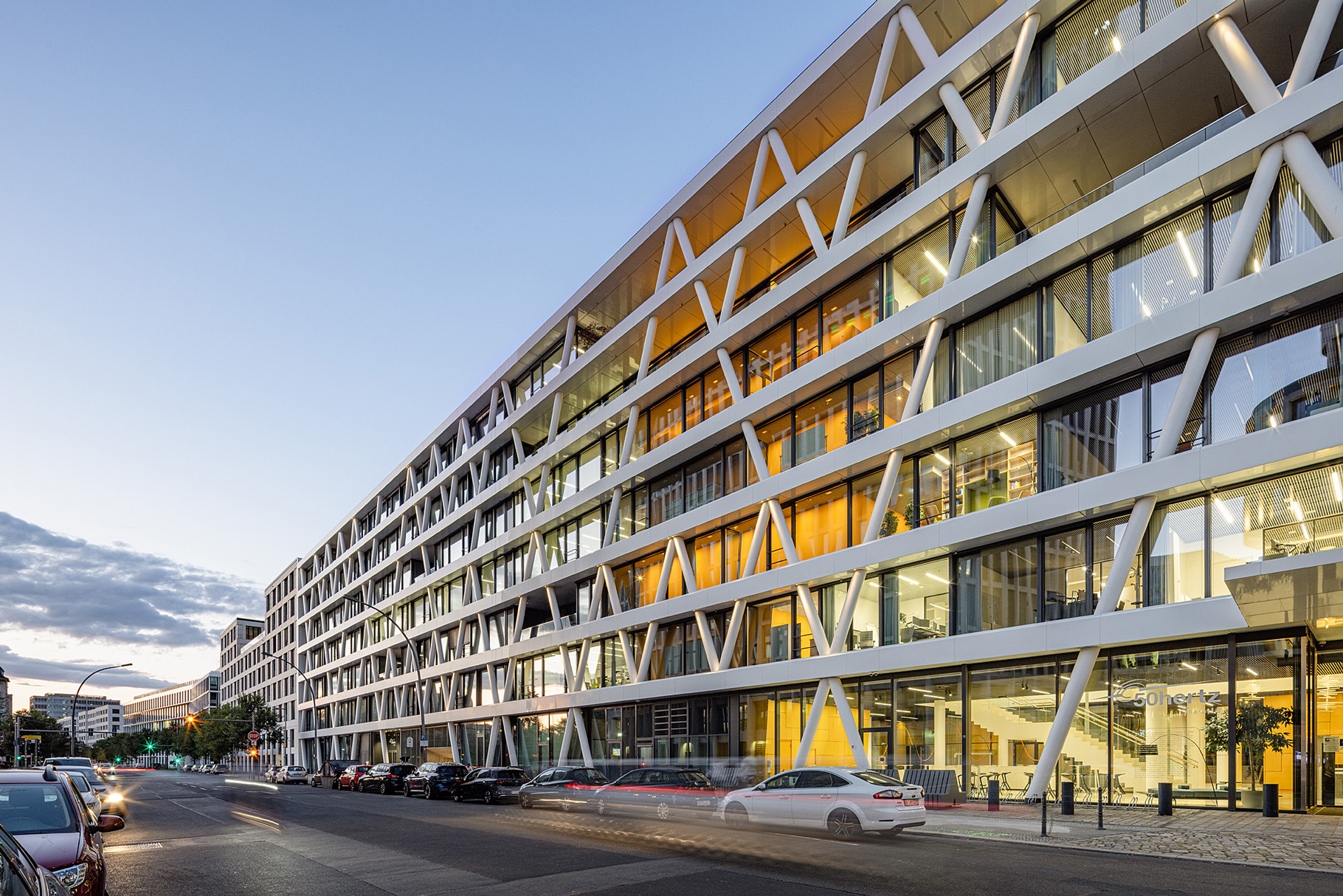 50hertz is located in the center of Berlin, in the immediate vicinity of the main train station, adjacent to the government district, which includes the Reichstag and the Federal Chancellery. The first building section was completed in record time, back in 2016, by around 680 employees. This work received numerous awards and prizes, and it is acknowledged as a reference icon when it comes to informal and communication-oriented workplace concepts with a strong identification factor. At the beginning of 2023, construction of phase 02 started for another 400 employees.